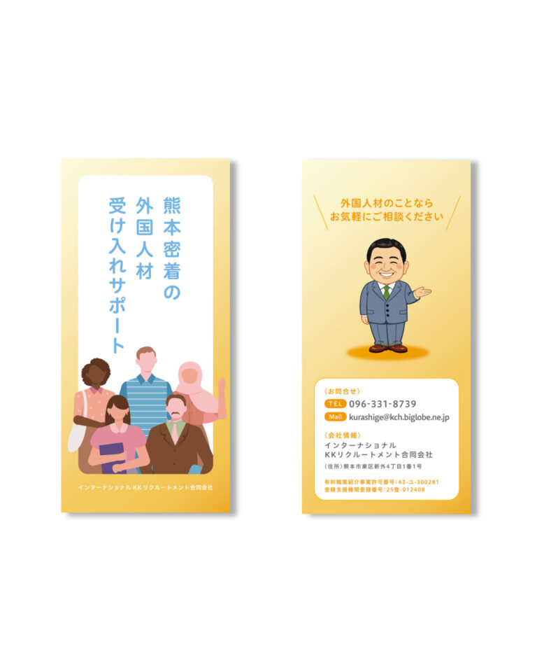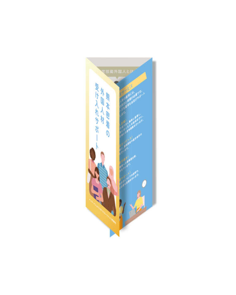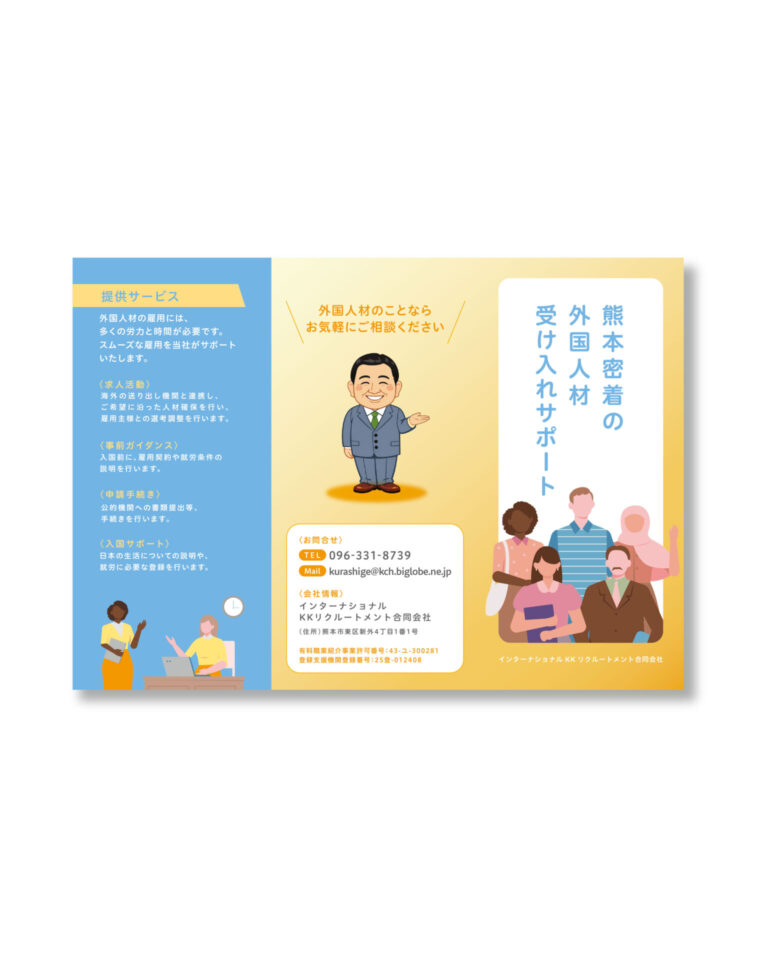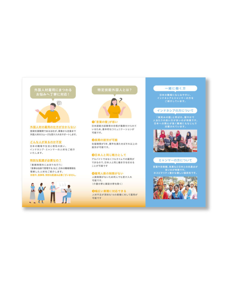 外国人材の派遣事業紹介リーフレットを制作した。特定技能外国人について、制度や企業側の雇い入れの際の不安を解消する構成とした。温かみのある配色とイラストを入れることで、事業や会社の柔らかく親しみやすい雰囲気が伝わるようなデザインとした。
